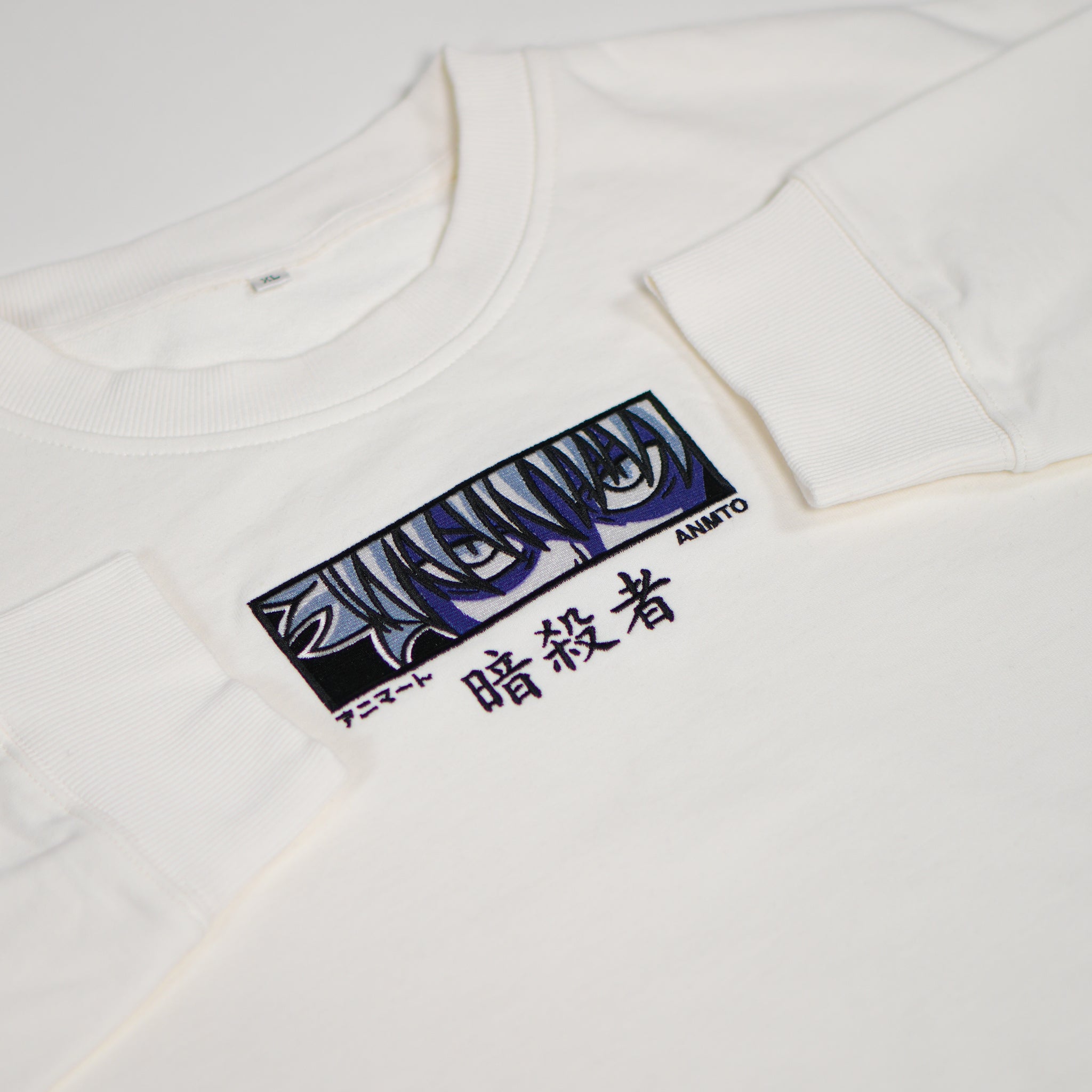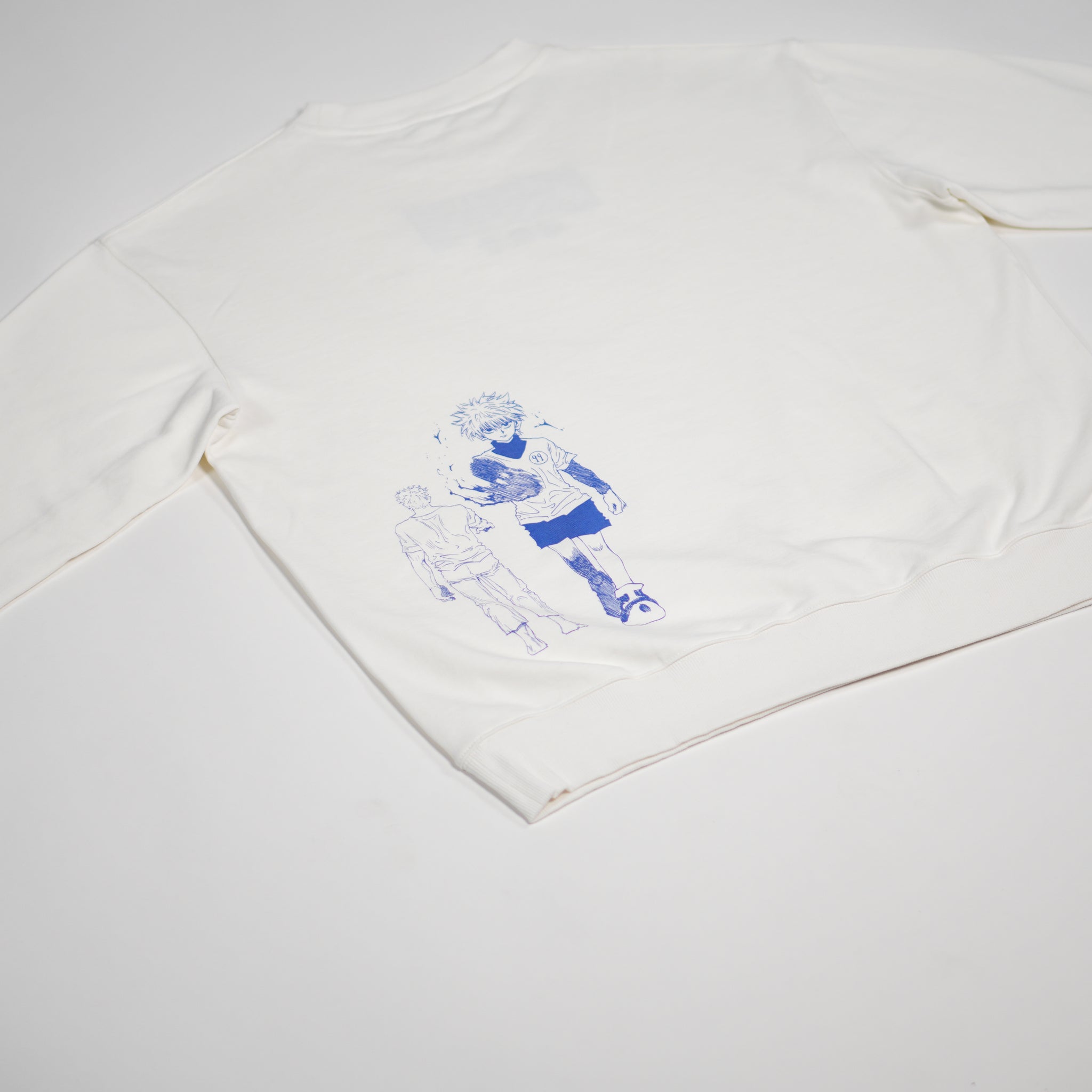 This crewneck is a revamped design of an old classic t-shirt. It was a fan favourite at the time, and now it has returned with much upgraded materials and fittings in a crewneck variation. It's a crewneck with a simple concept combined with beautiful execution. The front has an embroidery of the character with his icy stare. The back is water based print of an iconic scene from the manga. Between the two designs and the buttery smooth white fabric, this piece will look good in any collection.