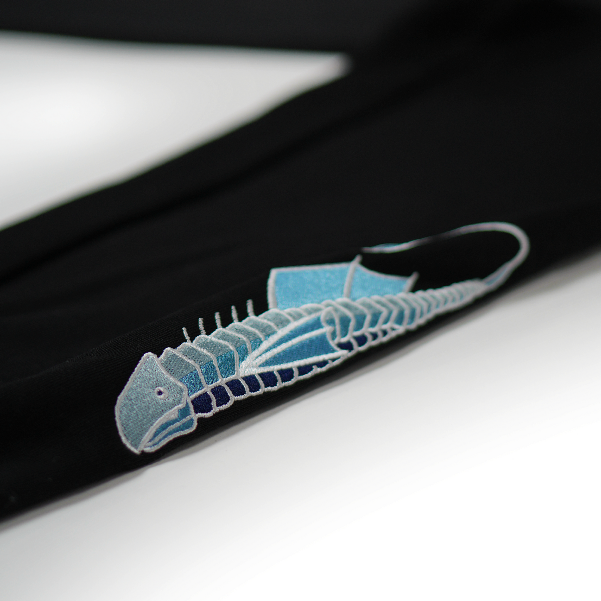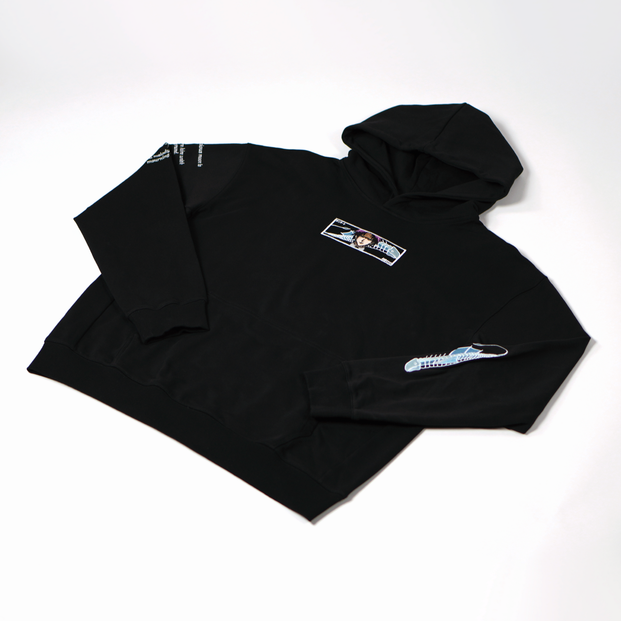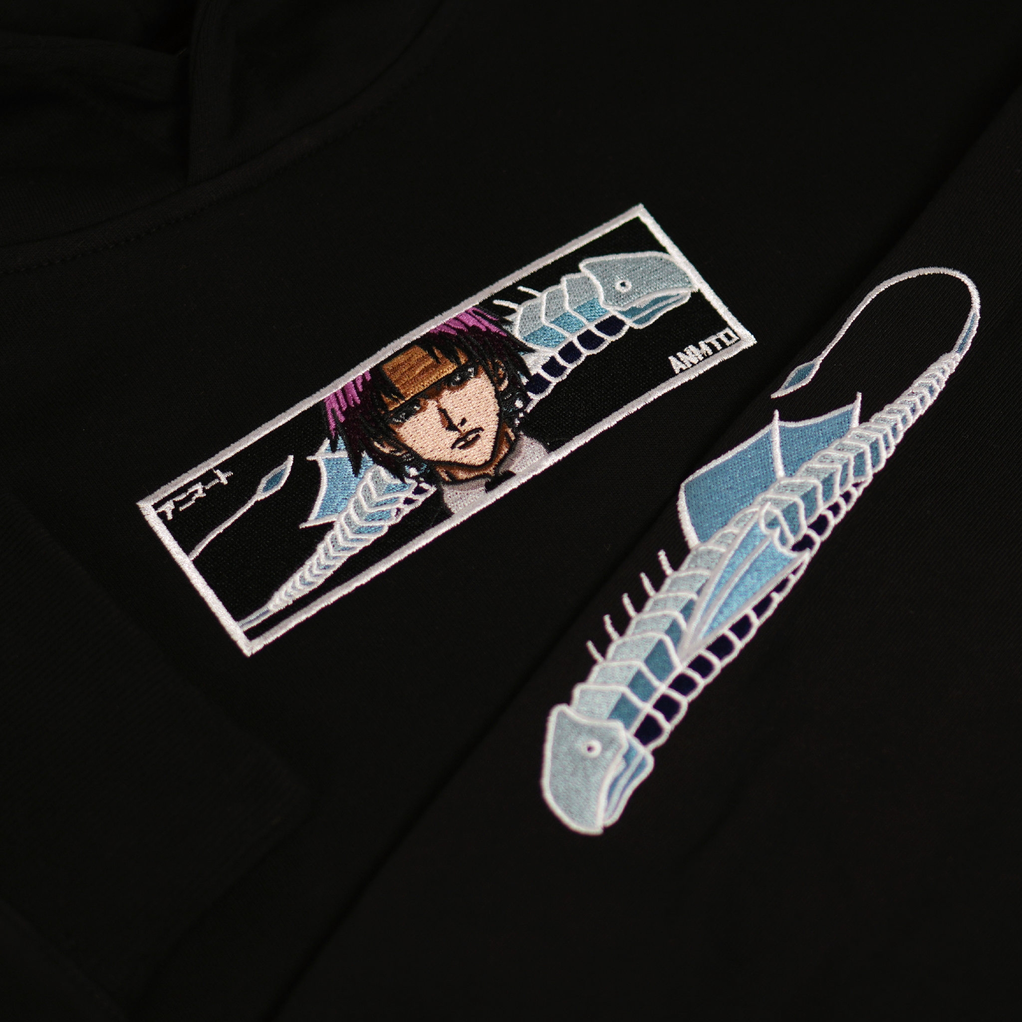 This hoodie is a revamped design of an old classic that was dropped back in 2021. This piece was a huge hit, and this is the first time since then that it has returned, now with upgraded materials and fittings. It's a hoodie with a simple concept combined with beautiful execution. The front has an embroidery of the character with the nen fish behind him. The left wrist has the nen fish embroidered. The right sleeve has the poem of his prophecy written and the next part of this prophecy is written on the sleeve of the Revenge crewneck. Lastly, the back of this hoodie has an embroidered design of the 12-legged spider, which is the symbol of his troupe.