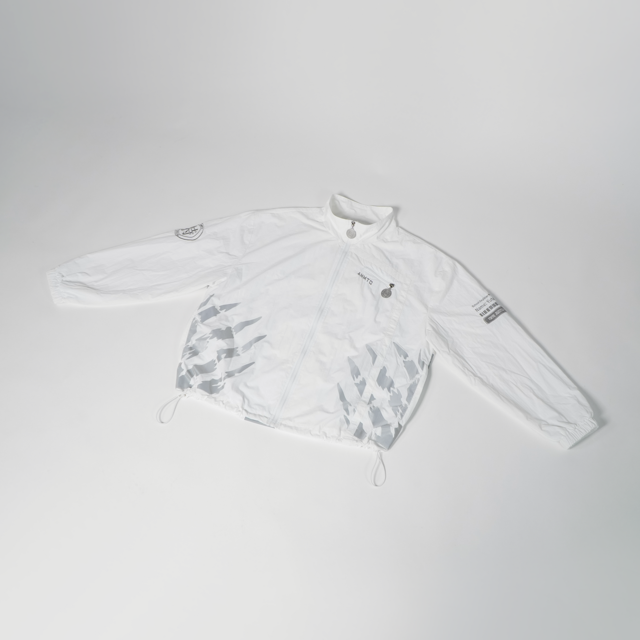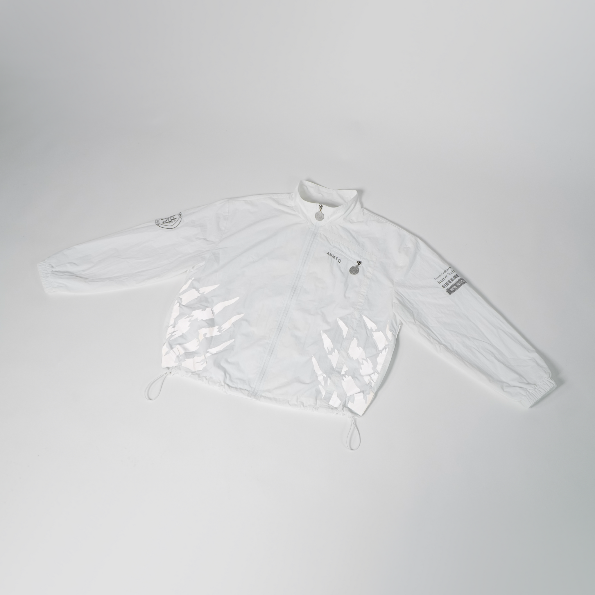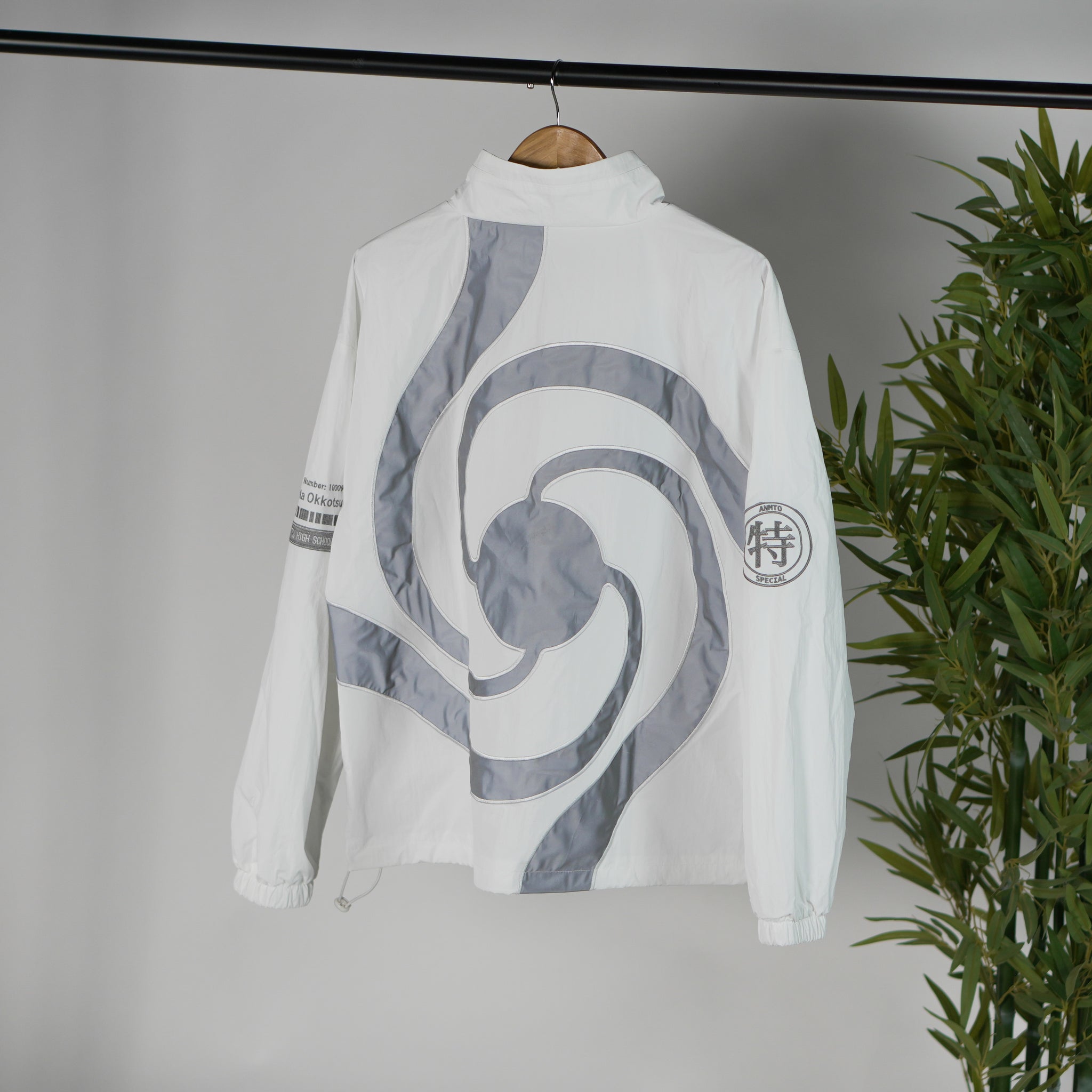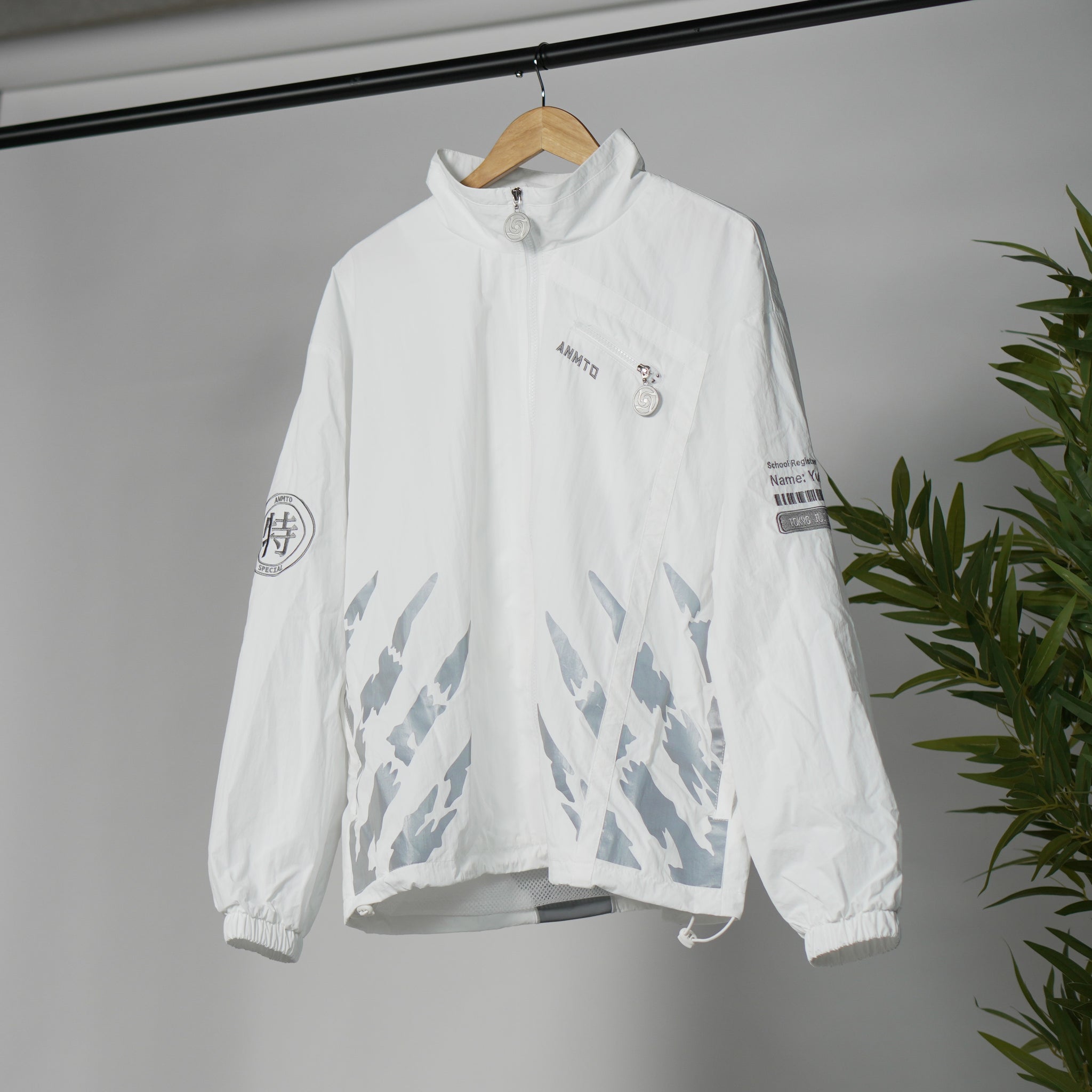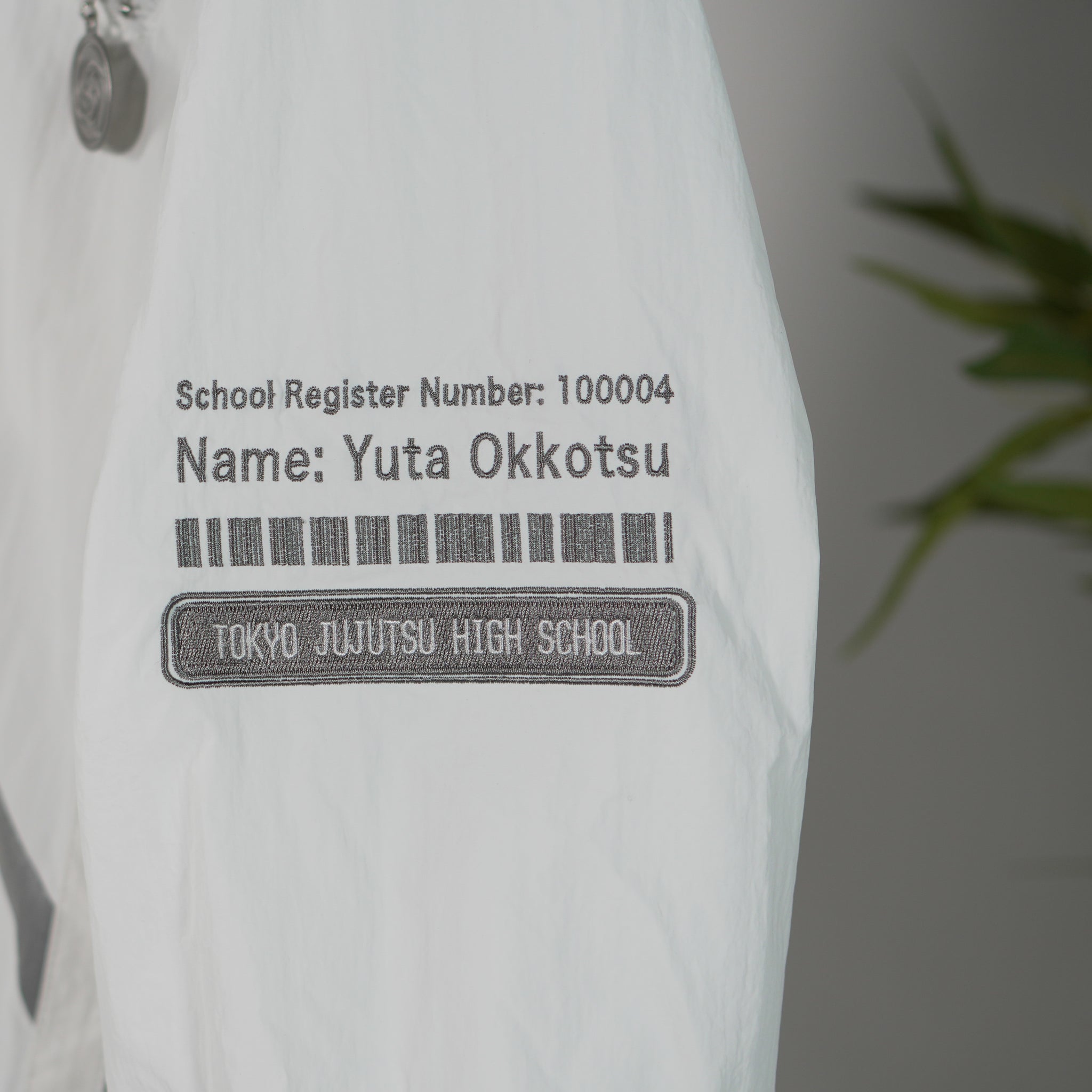 This windbreaker jacket is based on the jacket this character wears in the show! I wanted to recreate his jacket but with my own spin on it, so I made it a windbreaker with a centre zip design rather than the off-centre button design from the show.  I also added reflective elements on the front and back for depth. The hands on the front reference the queen of curses from the movie poster and the back has an edge-to-edge school symbol! I am very happy with how it turned out!